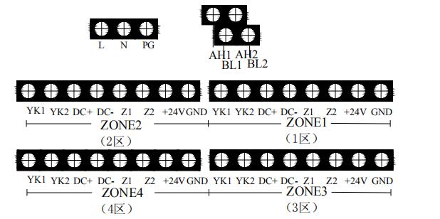 DC+、DC-:各區滅火氣體啟動電磁閥的驅動信號輸出端子,平時該端子間輸出電壓小于DC0.7V,啟動時輸出DC24V電壓且最大2A的信號。終端匹配電阻為4.7kΩ/0.25W。