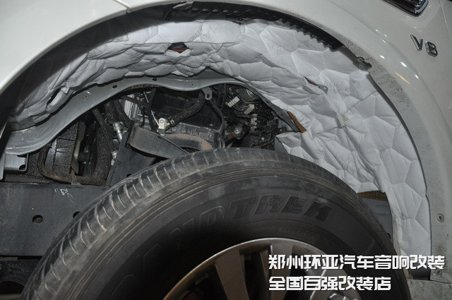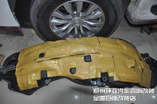 汽車高速行駛會產(chǎn)生很大的胎噪,為阻止胎噪的傳入。改裝技師特意將汽車的葉子板拆卸下來,使用大白鯊黃金甲和大白鯊吸音棉,分別對汽車的輪弧和葉子板做了隔音處理,從而切斷了胎噪的傳播途徑。