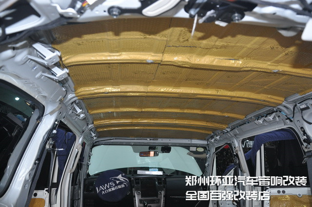 原車的頂棚只是一層單薄的鐵皮結(jié)構(gòu),陽光直射頂棚會使得車廂內(nèi)溫度急劇增加。改裝技師在使用大白鯊隔音材料,對汽車的頂棚做了隔音處理,這不僅維持了車廂內(nèi)的溫度恒定,同時也降低了頂棚處的噪聲。