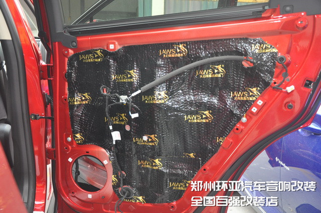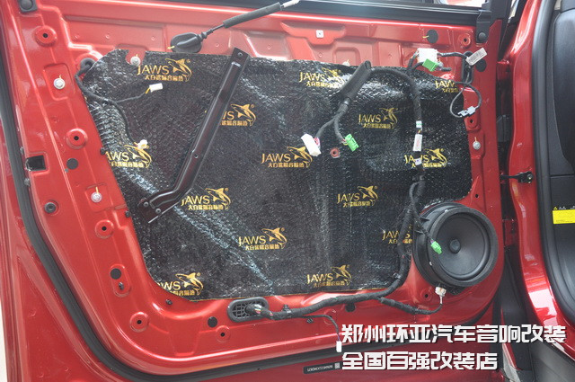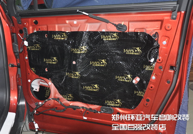 為降低風(fēng)噪的傳入,改裝技師使用大白鯊隔音減震膠,對汽車的門板做了雙層的隔音處理,這就讓門板形成了一個密封的箱體,不僅可以減少風(fēng)噪的傳入,同時(shí)也還可為聲場喇叭創(chuàng)造一個良好工作環(huán)境。